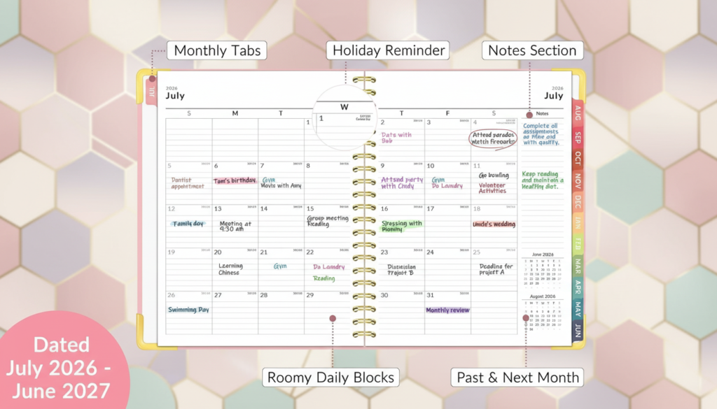 The Monthly Layer: Each month opens with a full-page calendar spread featuring generously sized date boxes. These are large enough to accommodate multiple entries per day — assignment due dates, appointment times, and bill due dates all coexist comfortably. This is where the hardcover planner 2026-2027 pulls ahead of many competitors: at 8.5″ × 11″, the monthly blocks have room to breathe, whereas A5-sized planners can feel cramped.