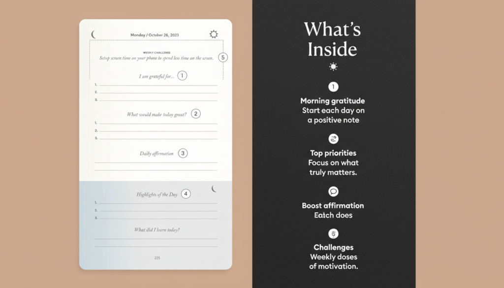 | Key Features | Structured AM/PM prompts, weekly challenges, daily affirmations, gratitude focus |
